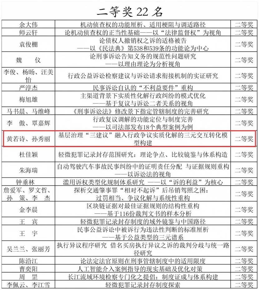 近日,孝感两级法院在学术研究与调研领域捷报频传,多项成果在省级及以上平台获奖。其中,孝感中院行政庭干警黄若诗作为研讨代表,受邀参加省法学会诉讼法学研究会2025年学术会并发言,其与院领导孙秀丽合著的论文《基层治理“三建议”融入行政争议实质化解的三元交互转化模型构建》荣获第十届“立丰杯”新苗奖二等奖。